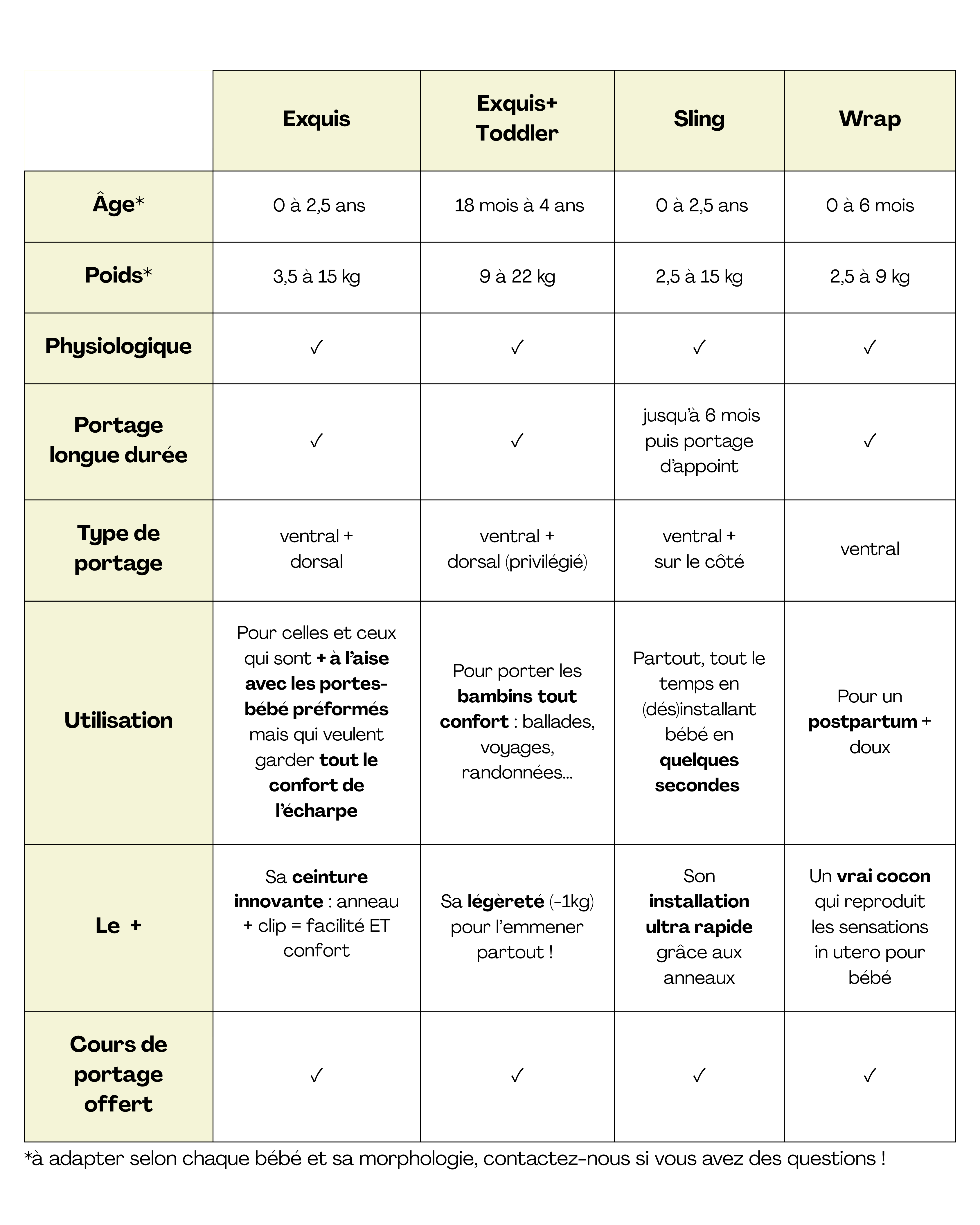 Here is some information about the characteristics of our range of physiological baby carriers to help you find the physiological baby carrier best suited to your needs.
